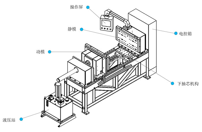 標準配置 ● 設(shè)備整體框架● 動靜模裝置 ● 下抽芯裝置 ● 下平移裝置 ● 控制系統(tǒng) ● 液壓系統(tǒng) ● 加熱系統(tǒng) | 選配功能 ● 旋轉(zhuǎn)傾斜機構(gòu) ● 安全防護護欄 ● 助力機械臂 ● 對接MES/ERP系統(tǒng) | 系統(tǒng)特色 ● 框架整體熱處理和加工,保證剛性● 下芯滑軌,耐磨耐臟設(shè)計 ● 漏料收集盤,保護下芯 ● 伺服液壓系統(tǒng),節(jié)能降噪 ● 助力機械臂省力省心,操作方便 ● 生產(chǎn)工藝配方管理,任意存儲及調(diào)用 ● 對接MES/ERP系統(tǒng),數(shù)據(jù)化管理 |